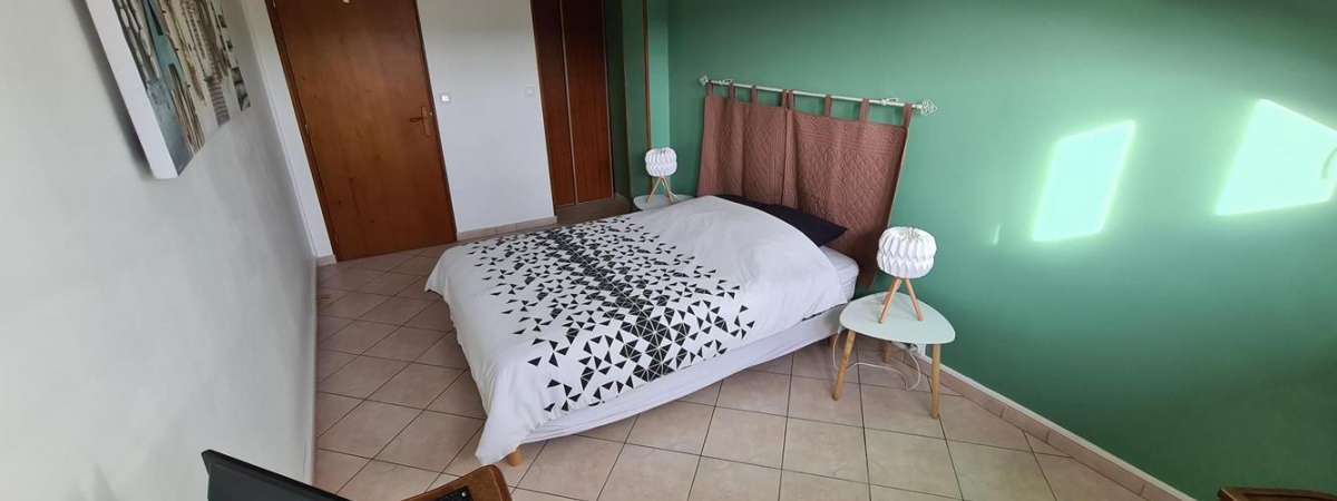 Ein Schlafzimmer mit Doppelbett, Möglichkeit, das Sofa im Wohnzimmer in ein zweites Doppelbett umzuwandeln.