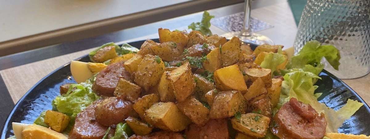 Traditionnelle Küche: hausgemachte Pommes Frites, frisches Gemüse, frischer Fisch