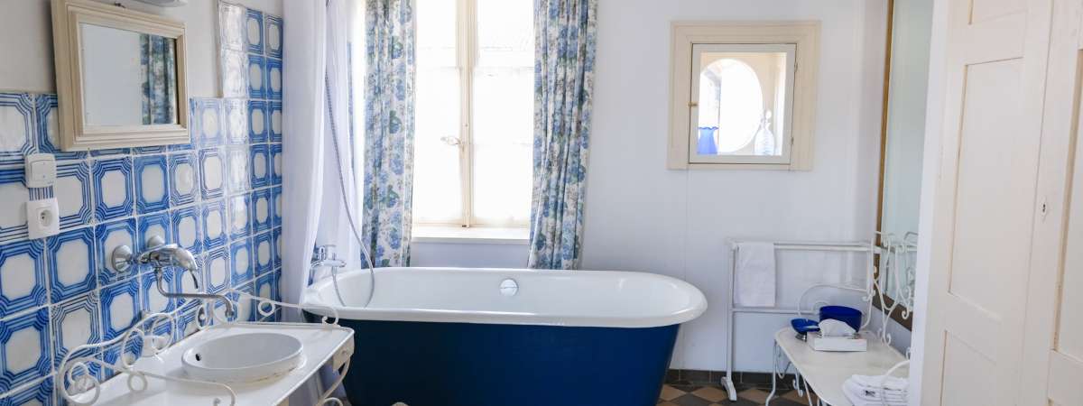 Our charming west wing suite comprises a bedroom with double bed (160 x 200), a bathroom with antique bathtub, separate toilet and living room. Windows overlook the château's two front courtyards. During the summer season, the suite can be rented with an additional room for 3 people (the balcony room, equipped with a double bed 160 x 200 and a single bed) as well as a large dining room with adjoining full kitchen.