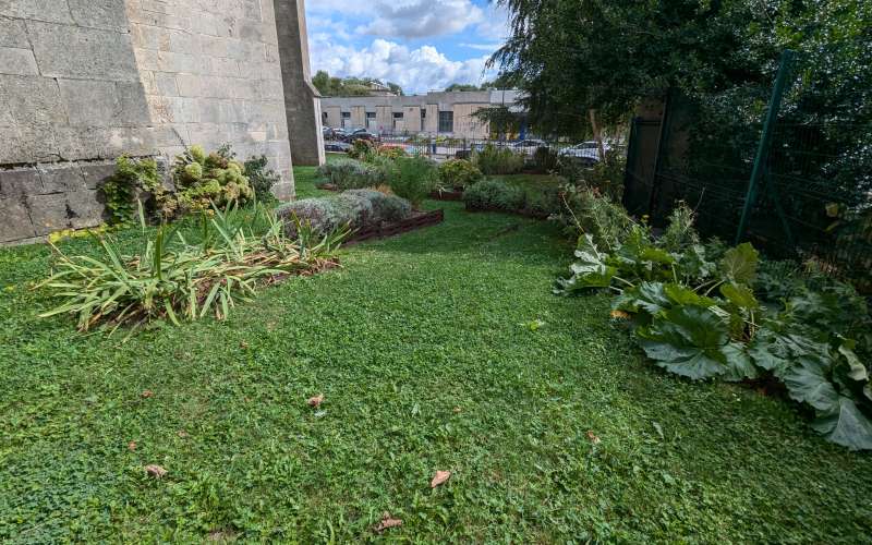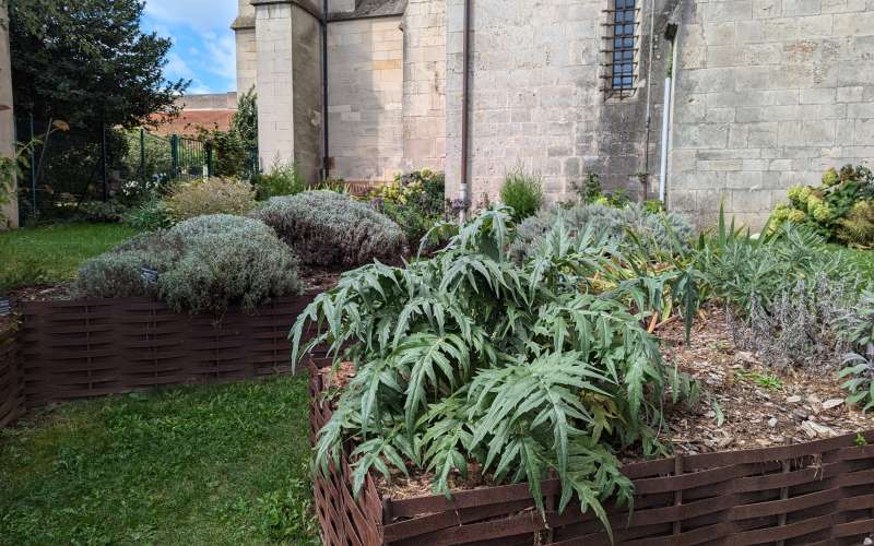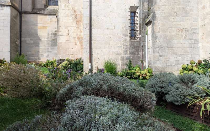 Le Jardin des Contreforts mêle de façon originale l’évocation du Moyen-Age à une touche de modernité, où plantes inspirées d’un jardin des simples côtoient en harmonie des plessis métalliques et des rampes engazonnées.
